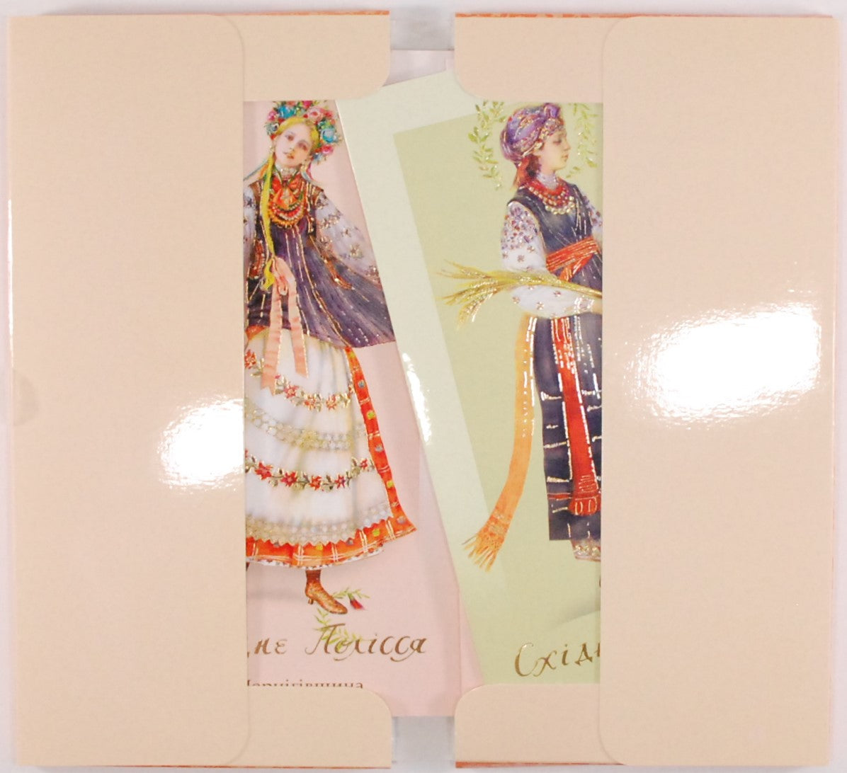A special art edition - set of 10 double-fold cards depicting women's folk costumes of various historical regions of Ukraine: Polissia, Chernihiv, Poltava, Slobozhanschyna, Zaporizhia, Vinnytsia, Odessa, Crimea. Glossy and shiny greeting cards with rich golden detailing.