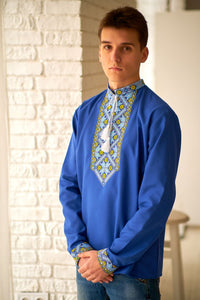Men's cotton blue Vyshyvanka with blue and yellow embroidery "Alatyr"