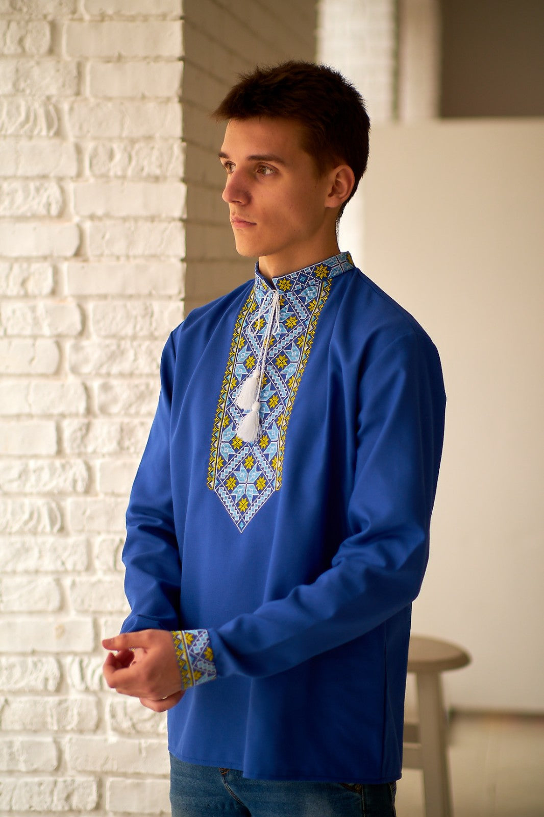 This beloved blue Vyshyvanka with blue and yellow embroidery is one of our most popular and cherished items. The meaningful blue and yellow color combination represents the Ukrainian flag, symbolizing national identity and unity.